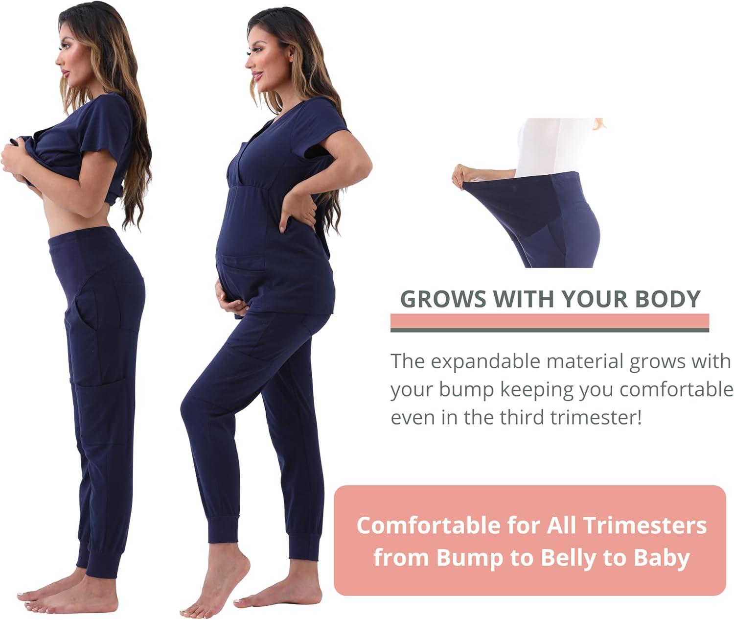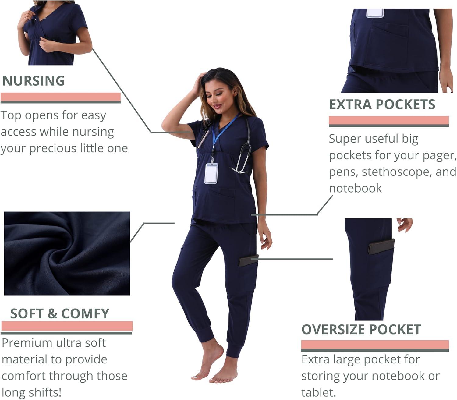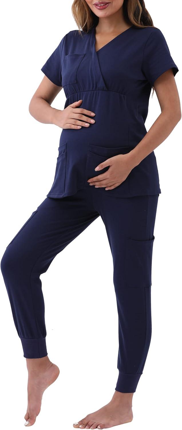 Maternity Scrubs Set for Women Nursing Scrub Top Pregnant Jogger Pants Pockets(Navy)
